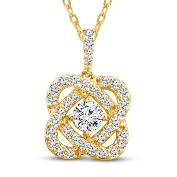 This stunning diamond necklace is a beautiful reminder that through life’s twists and turns, her love will keep you centered. This pendant features a gorgeous round center diamond surrounded by a swirling diamond design with 1 carat total diamond weight. The pendant is made of 14K yellow gold and hangs from an 18-inch cable chain that secures with a spring ring clasp.