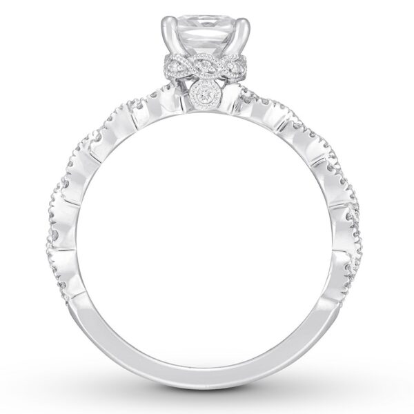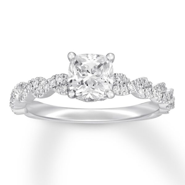 This spectacular engagement ring from Premiere collection features a stunning, modern design enlivened by an impressive array of independently certified diamonds. The brilliant 1-carat, cushion-cut diamond center pairs with dazzling twists of round diamonds on the band for a romantic look. Styled in 14K white gold, the ring has a total diamond weight of 1 1/5 carats.