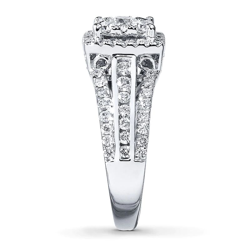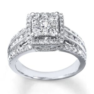 This fabulous bridal set for her features a round diamond enveloped in swirls of additional round diamonds at the center of the engagement ring. More round diamonds edge the 10K white gold band of the engagement ring and the matching wedding band. The bridal set has a total diamond weight of 3/4 carat.